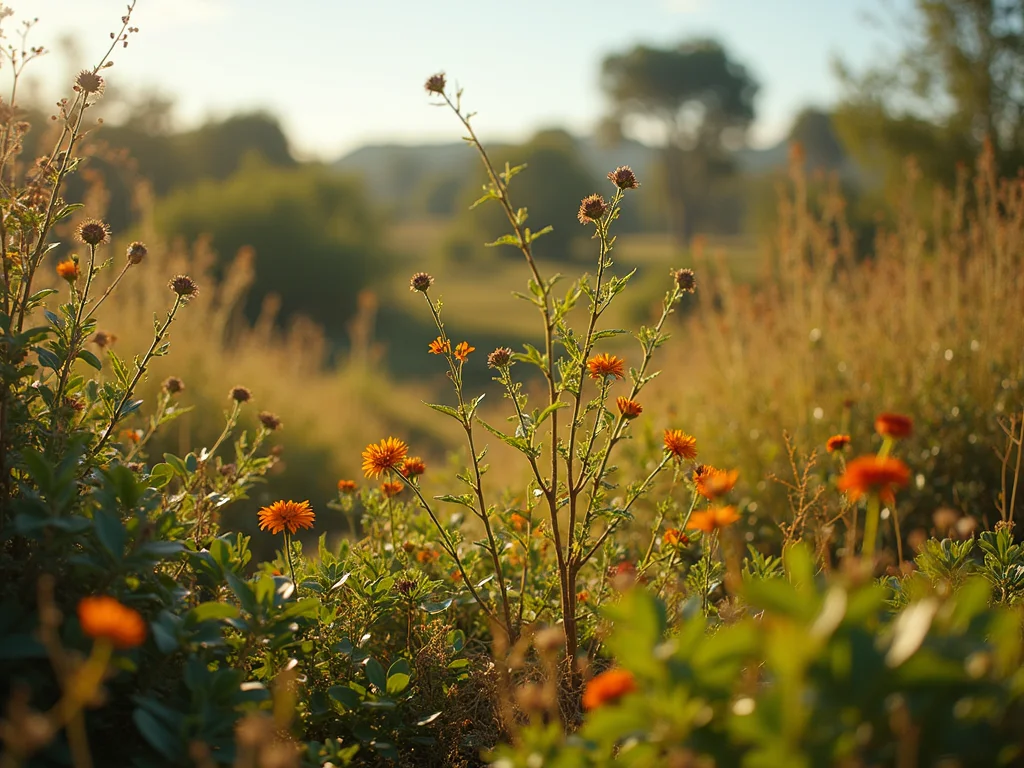 Um campo de gramíneas secas em tons de dourado e marrom, sob a luz suave do entardecer, com algumas flores silvestres pequenas e esparsas.